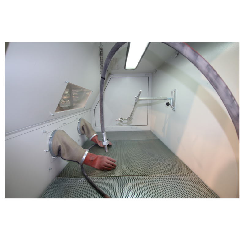 The pressure blasting unit 155 PB is especially designed for industrial usage, in which a high area performance is important. The components of the installation are selected to the requirements of the daily, tough usage in an industrial environment. The generous dimensioned working space enables the treatment of big and heavy components. The ergonomic principles which were already considered at the construction enable for long working hours at the unit.